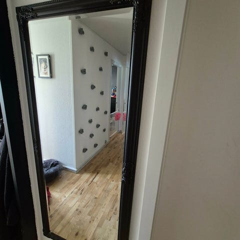 IKEA dekorativt spejl med ornamenter i beige. Spejlet har en detaljeret ramme med dekorative blomster- og mønsterudsmykninger. Farven er beige og materialet består af træ og glas.