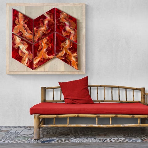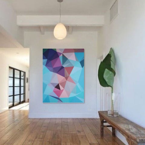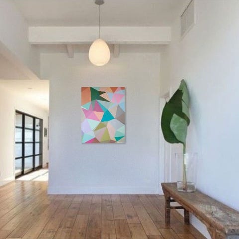 Abstrakt maleri som vægkunst i flerfarvede geometriske former på lys baggrund. Motivet består af trekantede felter i blandt andet pink, blå, grøn, gul, sort og orange. samt neon pink og kobber. Billedet egner sig til ophængning i stue, gang, kontor eller andre opholdsrum, hvor man ønsker et farverigt og moderne udtryk på væggen. Tag forbi mit studio for at se på maleriet.