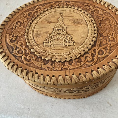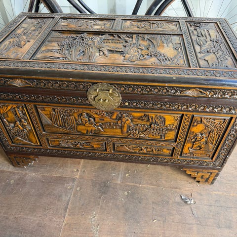 Rektangulær trææske med hængslet låg og orientalsk motiv på ydersiden. Æsken har mørk yderside med dekorerede scener og lysere, lakeret inderside. Velegnet til opbevaring af små genstande som smykker, skriveredskaber eller andre mindre ting.