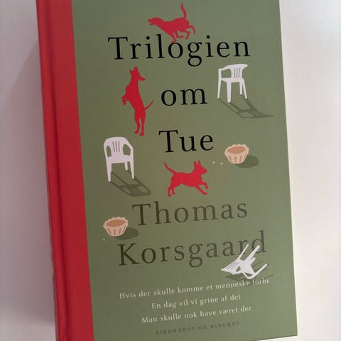 Thomas Korsgaard Trilogien om Tue bog i hård indbinding. Dansk skønlitterær romantrilogi samlet i ét bind. Bogen har rød ryg og grøn forside med illustrationer og forfatterportræt på bagsiden. Velegnet til læsere af moderne dansk litteratur.