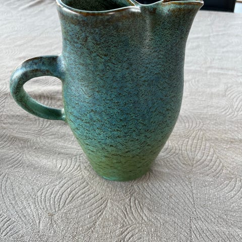 Sæt bestående af kande og kop i cremefarvet keramik. Kanden har integreret hank og hældetud, mens koppen har en enkel uden hank. Begge dele har en glat, blank glasur og ensartet farve. Velegnet til servering af varme og kolde drikke ved borddækning i køkken eller spisestue.
