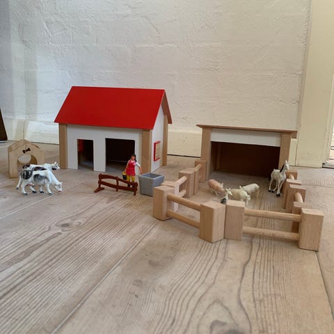 Fin bondegård med hegn og græs foran. Som ny. Dyr kan evt tilkøbes billigt.