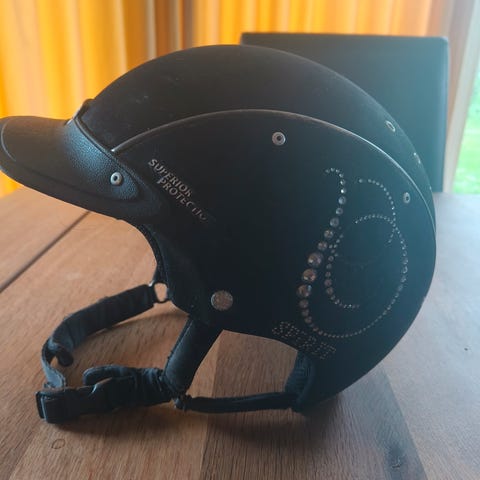 Pæn og velholdt ridehjelm, som udelukkende er brugt til stævnebrug. Mangler ingen sten og har ingen ridser eller skrammer.