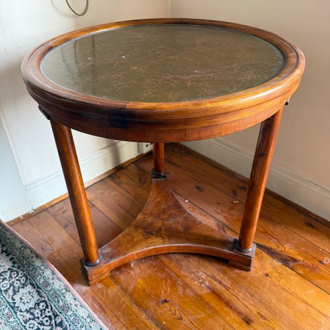 Bordet er brugt og har almindelige brugsspor i bordpladen, men er stabilt og solidt.
