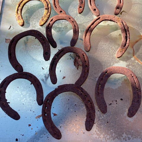 Hestesko i metal i rød farve. Flere brugte sko med patina og rust, velegnet til dekoration, hobbyprojekter eller genbrug til smedearbejde. Sættet består af forskellige størrelser hestesko i samme stil og materiale. Tag alle 10 for 100kr
