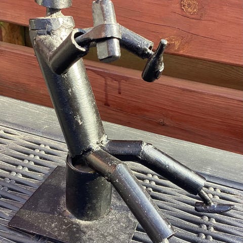 Dekorativ metalfigur i minimalistisk, lineært design. Figuren forestiller en stiliseret siddende person udført i tynd metaltråd på rund fod. Velegnet som enkel pyntegenstand til hylde, reol eller vindueskarm i stue, kontor eller entré.