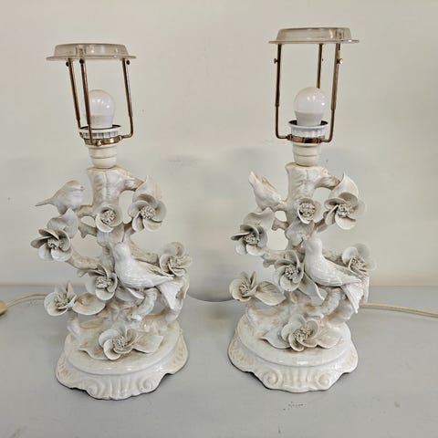 Bordlampe i form af gren med fugle og blomster. Sandsynligvis fra Erama, Italien. Mindre afslag forekommer samt rep. Ledninger bør efterses da der er spor efter gnavere. H. 40 cm.