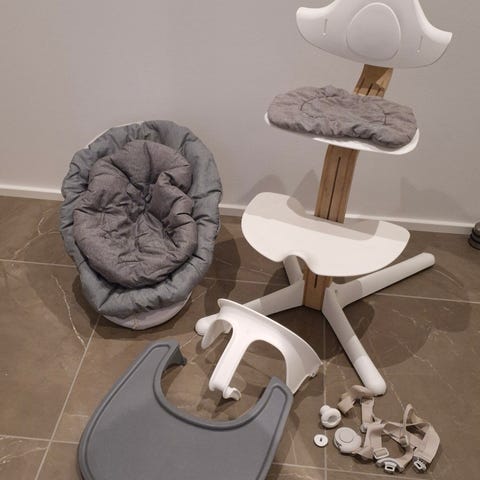Der er desuden tilbehør til babystol. Der er spisebakke og sæde ryg der kan lave stolen til alm barnestol