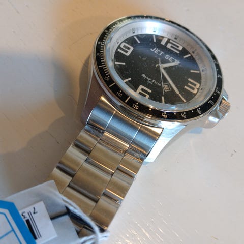 Jet Set herreur til mænd med sølvfarvet urskive og tydelige sorte talmarkeringer. Uret har chronograph-funktion med tre små hjælpeskiver samt datovisning. Urkassen og lænken er i sølvfarvet metal med foldelås, hvor Jet Set-logoet er præget. Bagsiden angiver vandtæthed og modeloplysninger. Velegnet som hverdags- og fritidsur til mænd, der ønsker et analogt armbåndsur med stopursfunktion og metal-lænke.