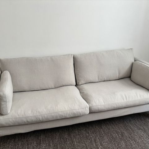 Sofa model “Julie”. Købt for Ingvard Christensen i 2014. Fremstillet i sæbebehandlet bøg med hynder i går uld. Mener at nypris var ca. 14.000kr. Sofaen er brugt sparsomt og fremstår i virkelig god stand. For mål - se billede 6.