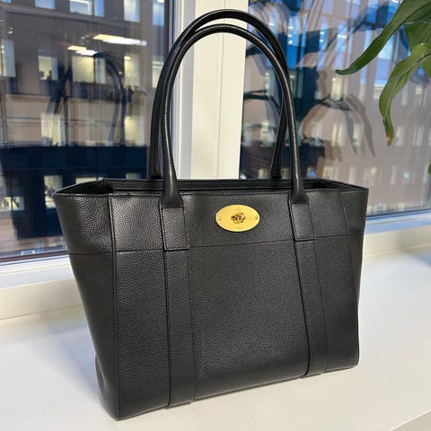 Mulberry Bayswater lædertaske til kvinde i sort. Tasken er udført i glat og let struktureret læder med to bærehanke. Den lukkes med klap og karakteristisk metalplade med drejelås på fronten. Indvendigt har tasken et hovedrum med lynlåslomme og åben lomme samt mindre læderdetaljer. Egnet som hverdagstaske eller arbejdstaske med plads til personlige ejendele og mindre accessories.