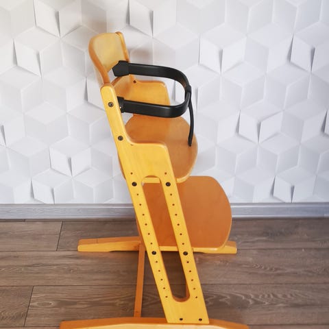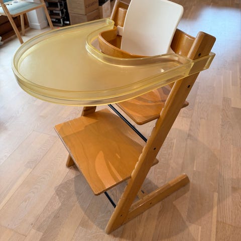 Stokke højstol i træ i naturfarve. Klassisk justerbar højstol med fodplade og siddeplade, der kan tilpasses barnets højde. Egnet som spise- og siddeplads ved bordet for børn. Enkel og funktionel konstruktion i massivt træ.
