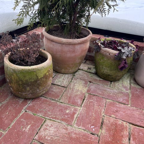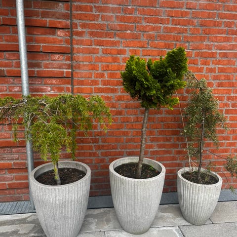 4 store keramik krukker med underskåle fra Deroma. Krukkerne er frostsikre.