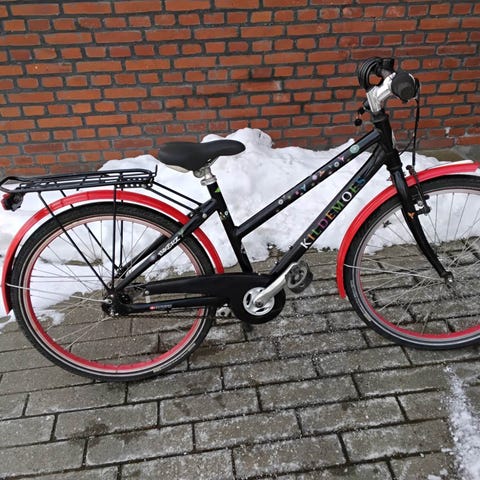 Pigecykel med 24" hjul i lilla og cremefarvet stel. Cyklen har lav indstigning og er egnet til kvinde/pige. Udstyret med bagagebærer, støtteben, skærme og reflekser. Velegnet til hverdagscykling i byen eller til skolekørsel.