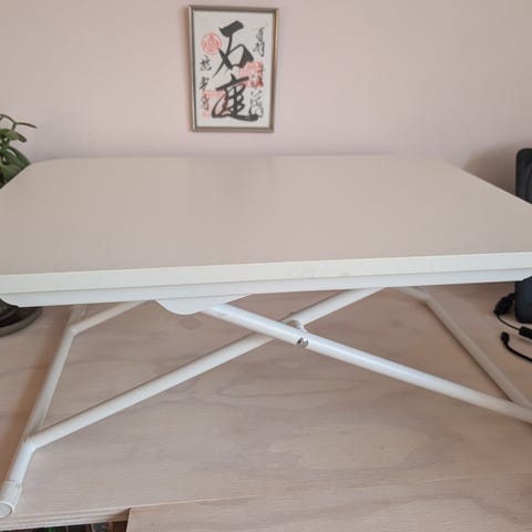 Sort hæve-sænke laptopstand til bord. Rektangulær plade med struktur i overfladen og ben i metal. Egnet til at hæve en bærbar computer, tastatur eller skærm til en mere ergonomisk arbejdshøjde på skrivebordet.