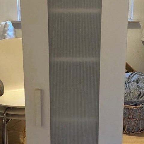 IKEA skab med glaslåger i hvid. Skabet har to låger med matteret glas og indvendige hylder, der giver mulighed for opbevaring og delvis gennemsyn af indholdet.