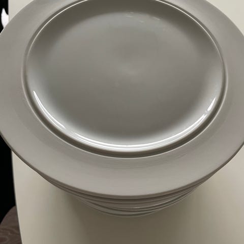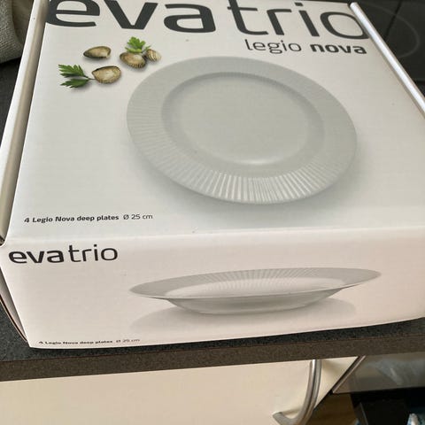 12 stk Eva Solo Eva-Trio dybe tallerkener i hvidt porcelæn. Tallerkenerne er runde med bred kant og dyb midte, velegnet til fx suppe eller pastaretter. Ifølge mærkningen er de egnet til mikroovn og ovn. Diameteren er ca 21,5 cm.