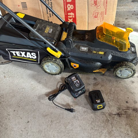 Texas plæneklipper i batteridrevet udgave. Plæneklipperen er i grå farve med gule detaljer og er velegnet til almindelig græsslåning i have og mindre græsarealer. Håndtaget er sammenklappeligt, hvilket gør den lettere at opbevare. Modellen anvender Ryobi batterisystem (batteri og lader afhænger af den konkrete pakke).