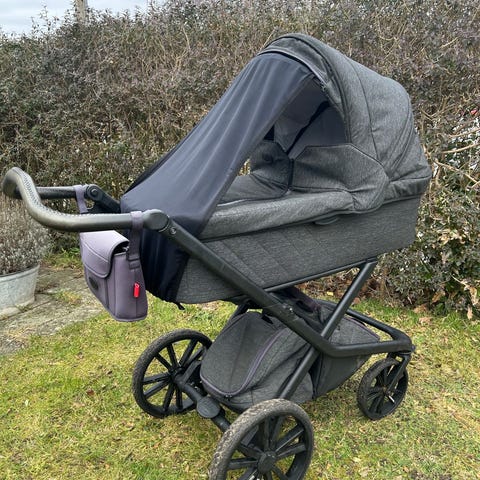 Fin Odder barnevogn med tilhørende sele, myggenet og regnslag. Dæk kan tages af og stellet klappes sammen. Kassen kan ligeledes også klappes sammen, så den er helt flad og klar til transport.