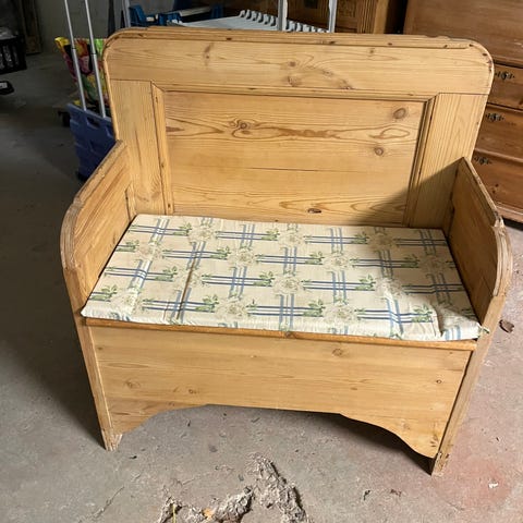 Træbænk med opbevaring i hvidmalet træ. Bænken har ryglæn og armlæn i et enkelt, klassisk design. Sædet kan løftes op, så der er opbevaringsplads i rummet under sædet. Velegnet til fx entré, køkken eller andre rum, hvor der er behov for både siddeplads og opbevaring. 190x85x52. SH:47cm.