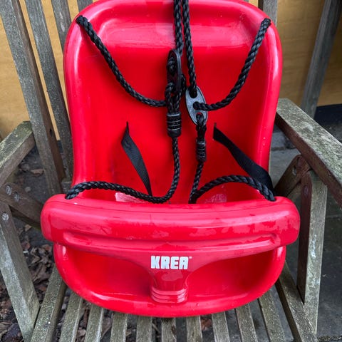 Barnesæde gynge i blå plast med snore til ophæng. Gyngen har høj ryg og frontbøjle samt integreret fodopdeling. Der er bærehåndtag i ryglænet og rem til fastspænding af barnet. Egnet til mindre børn til udendørs eller indendørs ophæng på stativ eller solidt ophængspunkt.