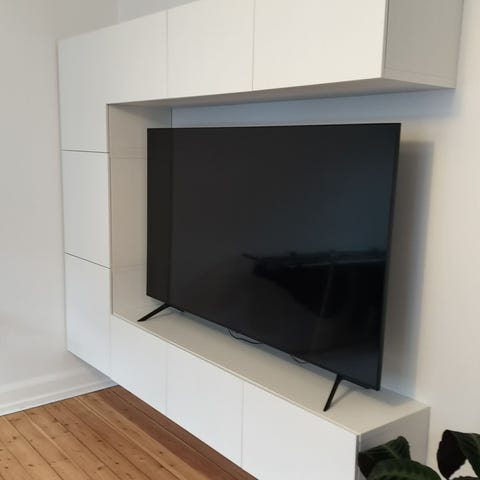 Sælger dette flotte BESTÅ TV-møbel-sæt fra IKEA i eg-look (lys brun). Sættet består af tre separate dele: to ens skabe med glaslåger og et lavt TV-møbel. Delene kan bruges samlet som en komplet stueløsning eller separeres og bruges individuelt.