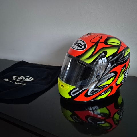 Arai RX-7 Corsair motorcykelhjelm i sort. Størrelse S, passer hovedomkreds ca. 55–56 cm (6 7/8). Fuldface-hjelm med klart visir og indvendigt blåt polster. Godkendt efter ECE 22-05 standard. Egnet til motorcykelkørsel på vej og bane, hvor der ønskes en lukket hjelm med høj beskyttelse og aerodynamisk form.