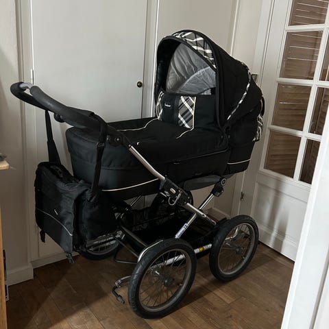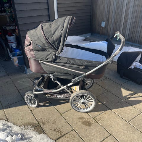 Emmaljunga barnevogn i sort. Vognen har liggedel med hvid madras/indlæg samt sort kaleche. Der medfølger også siddedel med sele og bøjle, som kan monteres på stellet. Stellet har fire hjul og justerbart styr. Kalechen viser tegn på slid med mindre huller, som ses på billedet. Forhjulene kan have svært ved at dreje, men de kan låses, så er der ingen problemer. Er brugt til to børn.