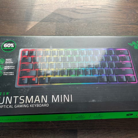 Razer Huntsman Mini tastatur. Kompakt gaming-tastatur i 60 %-layout, som fylder mindre på skrivebordet end et fuldstørrelses tastatur. Kablet tilslutning med aftageligt kabel. Taster med optiske kontakter, som registrerer tryk via lys. Tastaturet har indbygget RGB-belysning med flere farvezoner, der kan tilpasses via software. Velegnet til brug ved gaming eller generel computerbrug, hvor der ønskes et kompakt tastatur.