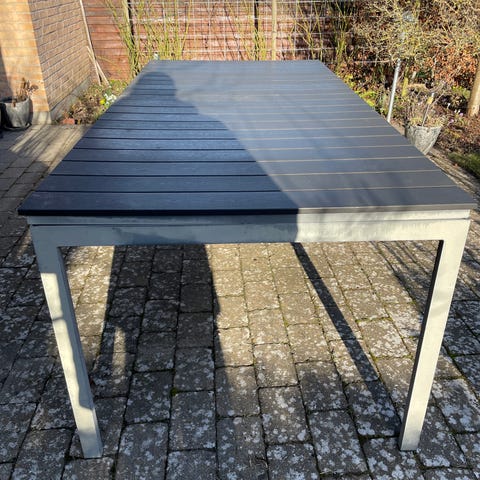 Havebord udtræksbord i sort med bordplade i kompositlameller og stel i metal. Bordet kan forlænges med indbyggede tillægsplader, så længden kan justeres efter behov. Velegnet til udendørs brug på terrasse eller altan. Sælges da vi ikke har plads til det. Tillægs plader ligger under bordplade når de ikke bruges. Materiale. Non-wood
