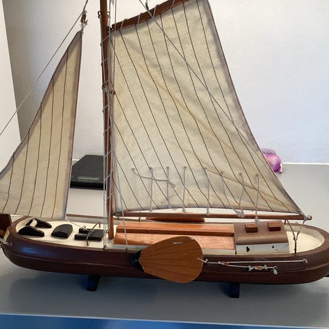 Modelskib i form af et klassisk sejlskib udført i træ med detaljeret skrog og master. Skibet er udstyret med flere master og sejl i lys tekstil. Modellen står på en lille træfod, der fungerer som displaystand. Egnet som dekoration eller samlerobjekt for modelskibe og maritime genstande.