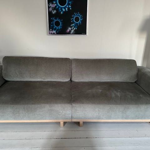 En super velholdt 3 personers sofa med puff fra Sofacompany. Farven hedder Maya Cream med egetræsben. Der medfølger et petroleums farvet velour betræk. Der kan købes nyt betræk hvis ønskes hos sofacompany.