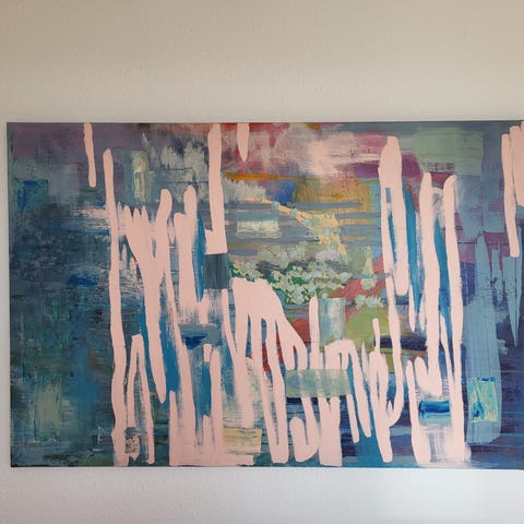 Flot og farverigt maleri med naturinspireret udtryk i blå, grønne og varme nuancer.