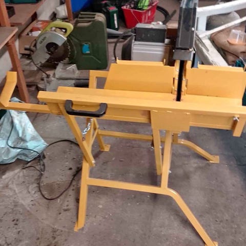 Q Log Saw 400 brændesav med hårdmetalklinge. Savens motor er på 2100 watt og drives med 230 volt. Klingen har en diameter på 400 mm, og den angivne kapacitet er Ø130 mm. Brændesaven står på et grønt stativ med integreret arbejdsbord og har betjeningspanel med start- og nødstopknap. Velegnet til opskæring af brænde og træemner inden for maskinens kapacitetsgrænser.