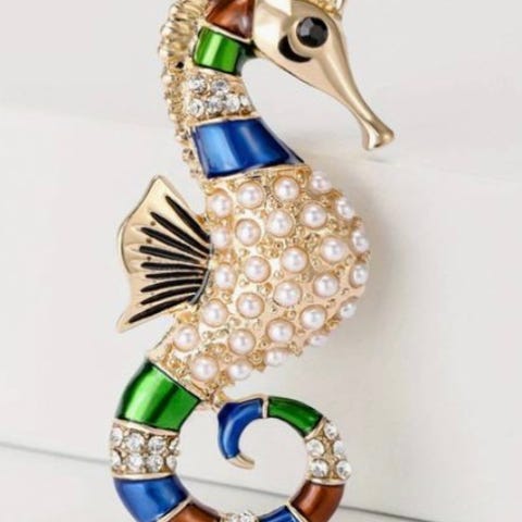 Broche, forgyldt, Cabouchon, Flot søhest med mange kubiske zirkoner.