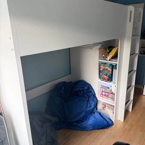 IKEA børneseng med integreret skrivebord og opbevaring i hvid. Sengen er udformet som en højseng med arbejdsplads nedenunder. Under sengen er der skrivebord med skuffesektion samt hylder og åben reol i siden til bøger og legetøj. Velegnet til børneværelse, hvor der ønskes kombination af seng, arbejdsplads og opbevaring i ét møbel.