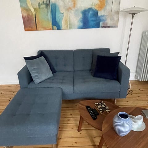 Fin blå 2 personers sofa med taburet. Ny pris 5300 kr. Ingen trapper.