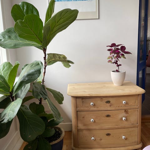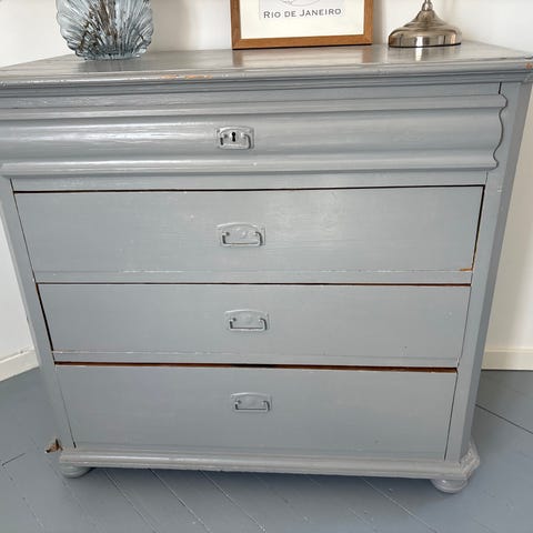 Kommoden har to store skuffer. Den bærer præg af slid og brug, se fotos. Har nye beslag som kan følge med gratis.