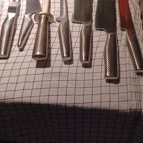 4 køkkenknive + magnetskinne, Global, Sælger de her 4 flotte Global køkkenknive + Global magnetskinne til at hænge knivene på.
