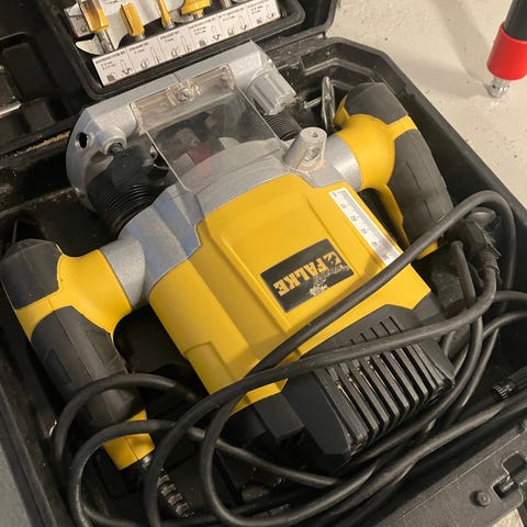 Scheer overfræser til træbearbejdning. El-drevet maskine med ledning og dobbelt håndtag for stabil føring. Egnet til fræsning af kanter, noter og udskæringer i træ og lignende materialer. Maskinen har justerbar dybdeindstilling og bundplade til præcis styring langs emnet. Pæn og velholdt, virker som den skal.