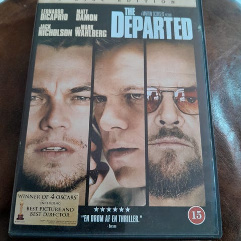 The Departed dvd film. Standard dvd-udgave af spillefilmen The Departed. Forsiden viser tre hovedpersoner samt aldersmærkning 15 år. Velegnet til afspilning på dvd-afspillere, der understøtter regionen angivet på omslaget.