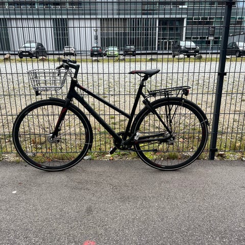 Velholdt og køreklar dame Citybike med 7 g og lækre detaljer såsom vedligeholdelsesfrit carbon remtræk, trådløs cateye computer, LED lygter og ABUS Pro Shield ringlås i taske under sadlen