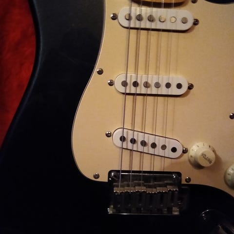 En lækker lille Strat til både børn og sofaen. Jeg har selv købt den brugt, men har netop slebet bånd, justeret og intoneret den med Earnie Ball Regular Slingy (10-46).