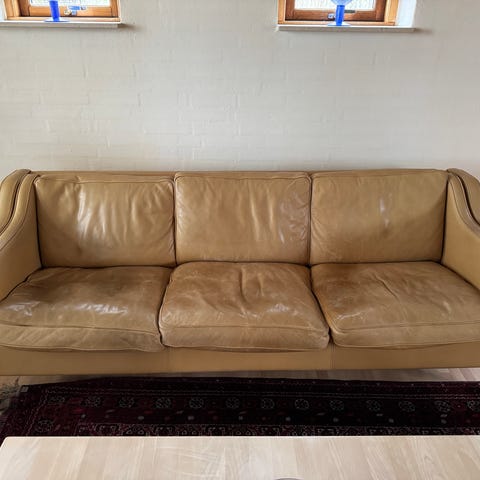 Arkitekttegnet lædersofa fra Mogens Hansen, slidt og blød, men stadig smuk. Bud er velkomne. Afhentes på Frederiksbjerg, Århus.
