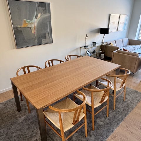 Naver spisebord GM 2100 i længde 230. Der medfølger to sort malede tillægsplader så bordet kan blive 330 langt. Der kan sidde 12-14 personer omkring bordet.