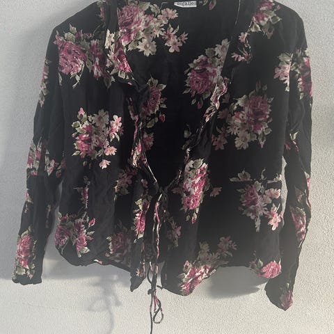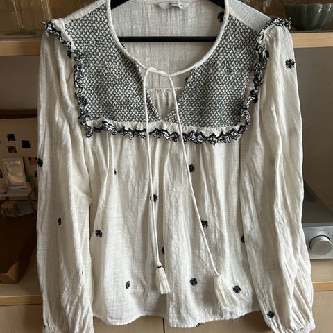 Pigalle bluse i størrelse XL. Blusen er peache med små mønstrede detaljer og er fremstillet i viskose. Den har slå-om-effekt foran, lange ærmer og elastik i taljen for let facon. Velegnet som hverdagsbluse eller til mere pænt brug.