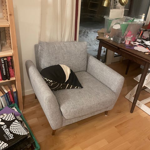 Lænestol fra IKEA. Super god at sidde i men ikke så pæn mere. Kan muligvis renses.