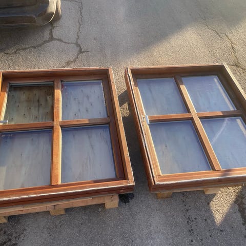 5 stk maghoni vinduer i god stand. Tophængt. 2 lags glas.