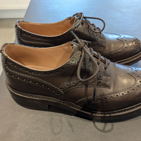 Super lækker og solid herresko fra engelske Tricker’s. Ingen brugsspor på overdel, men der er gået i skoene, hvilket kan ses på sålen. Trænger dog slet ikke til at blive skiftet. Størrelsen er 9.5 og modellen er stor i størrelse. Tjek evt. Tricker’s guide for deres Bourton sko.