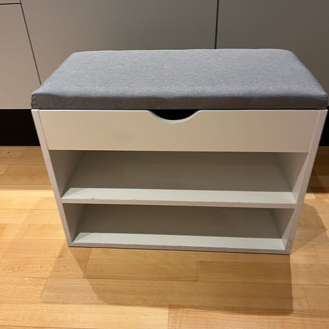Jysk skunk med opbevaring i hvidmalet træ; egnet til opbevaring af f.eks. puder, tæpper eller legetøj. Velegnet til brug i entre, soveværelse som opbevaringsmøbel.